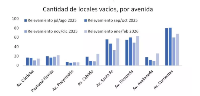 Asimismo, reveló que con respecto a la medición anterior, correspondiente a noviembre-diciembre de 2025, se detectó un crecimiento del 43,4%, ya que en el final del año pasado los locales vacíos habían sido 198.